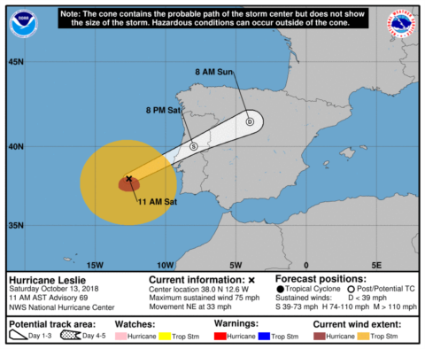 O Centro Nacional de Furacões (NHC) do serviço meteorológico norte-americano actualizou a informação sobre a Leslie perto das 16h de Lisboa, sublinhando que a tempestade “ainda é um furacão” a esta hora, embora deva chegar ao território continental já como um “ciclone pós-tropical”.